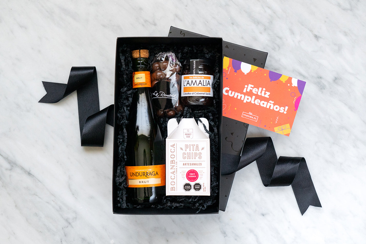 • Caja de Cartulina con Tapa Negra+Barniz y Cinta de Satín.